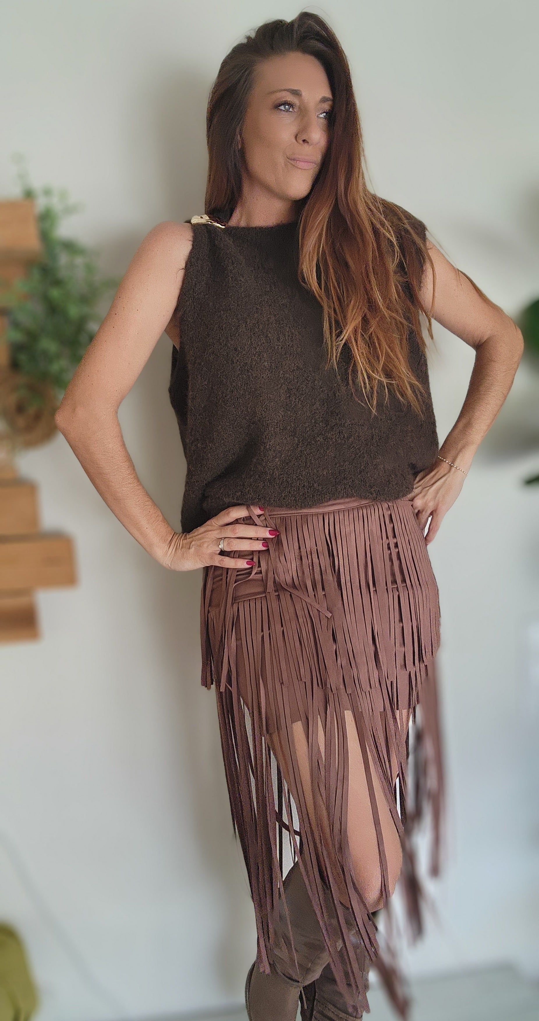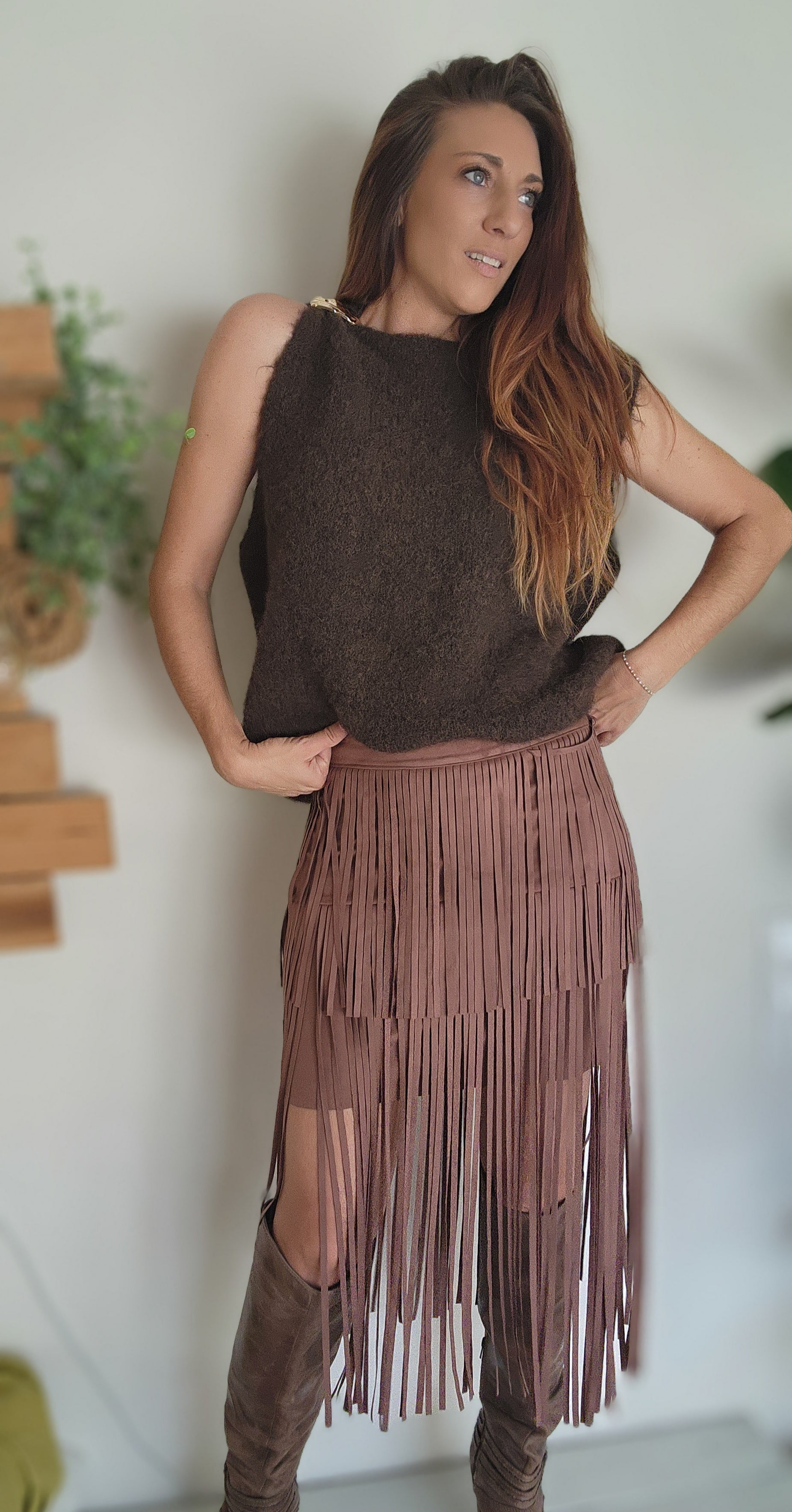 Avec son effet suédine ultra tendance et ses magnifiques franges, cette jupe moderne apporte une touche bohème chic à votre look. Préparez-vous à recevoir des compliments à chaque fois que vous la porterez !