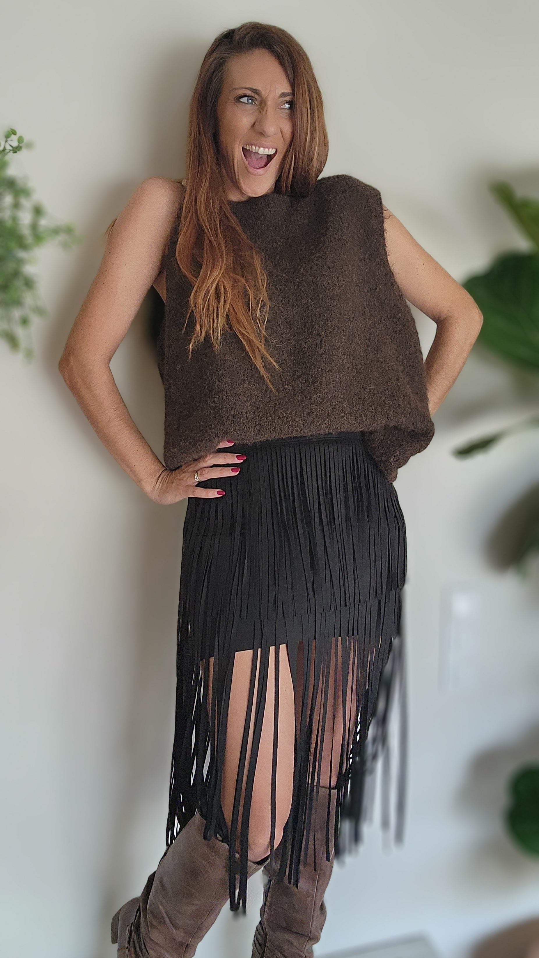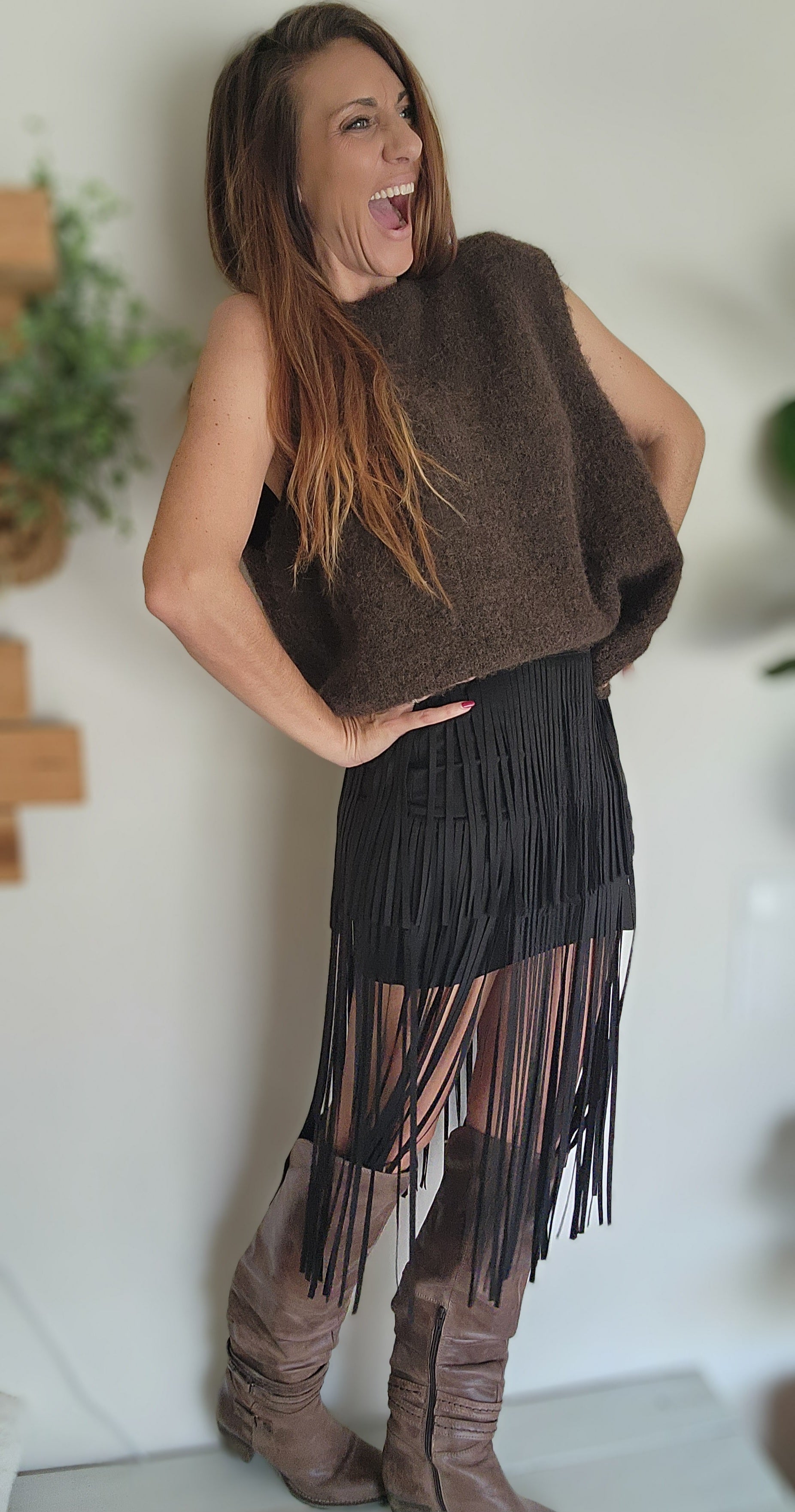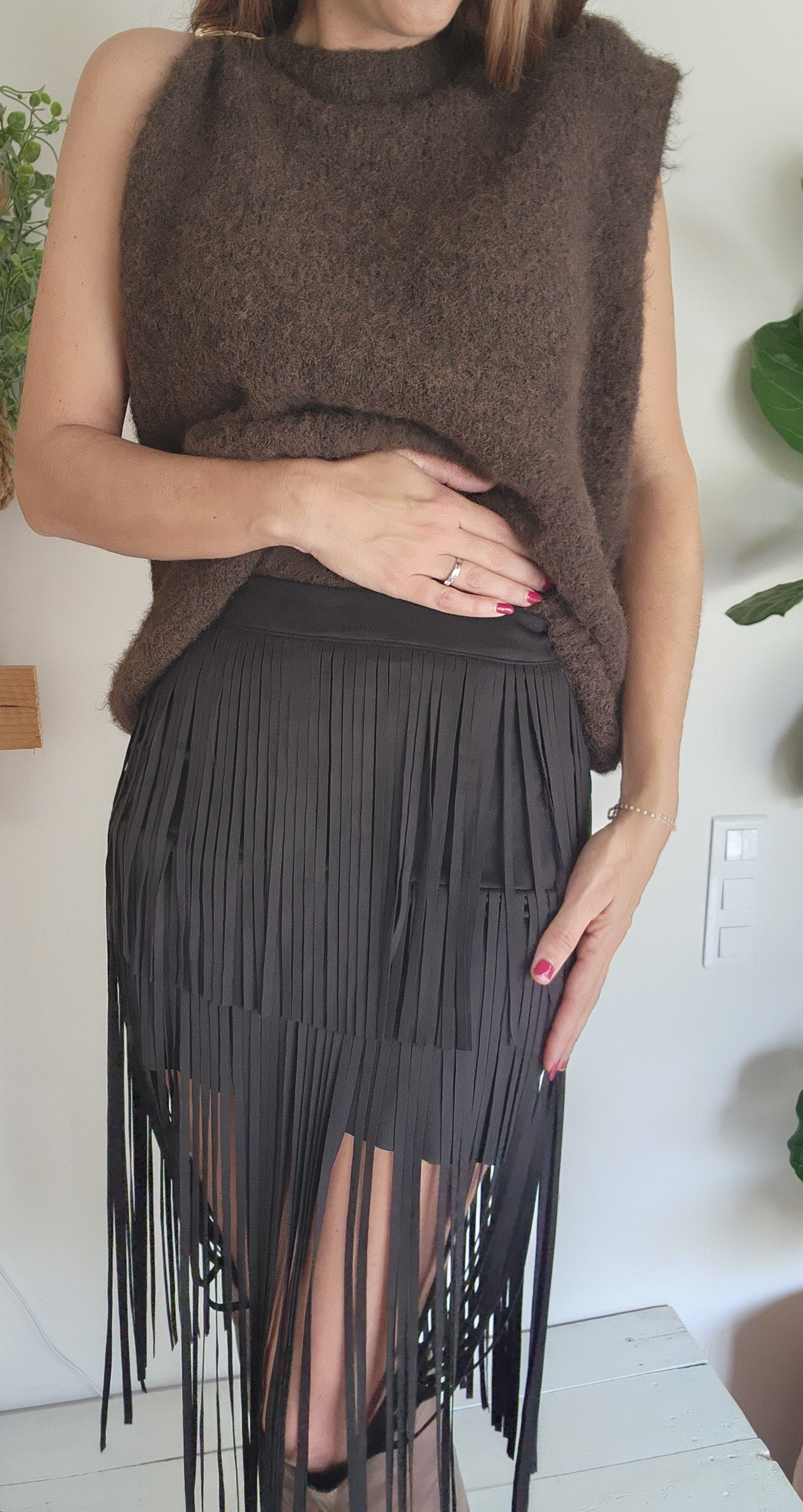Avec son effet suédine ultra tendance et ses magnifiques franges, cette jupe moderne apporte une touche bohème chic à votre look. Préparez-vous à recevoir des compliments à chaque fois que vous la porterez !