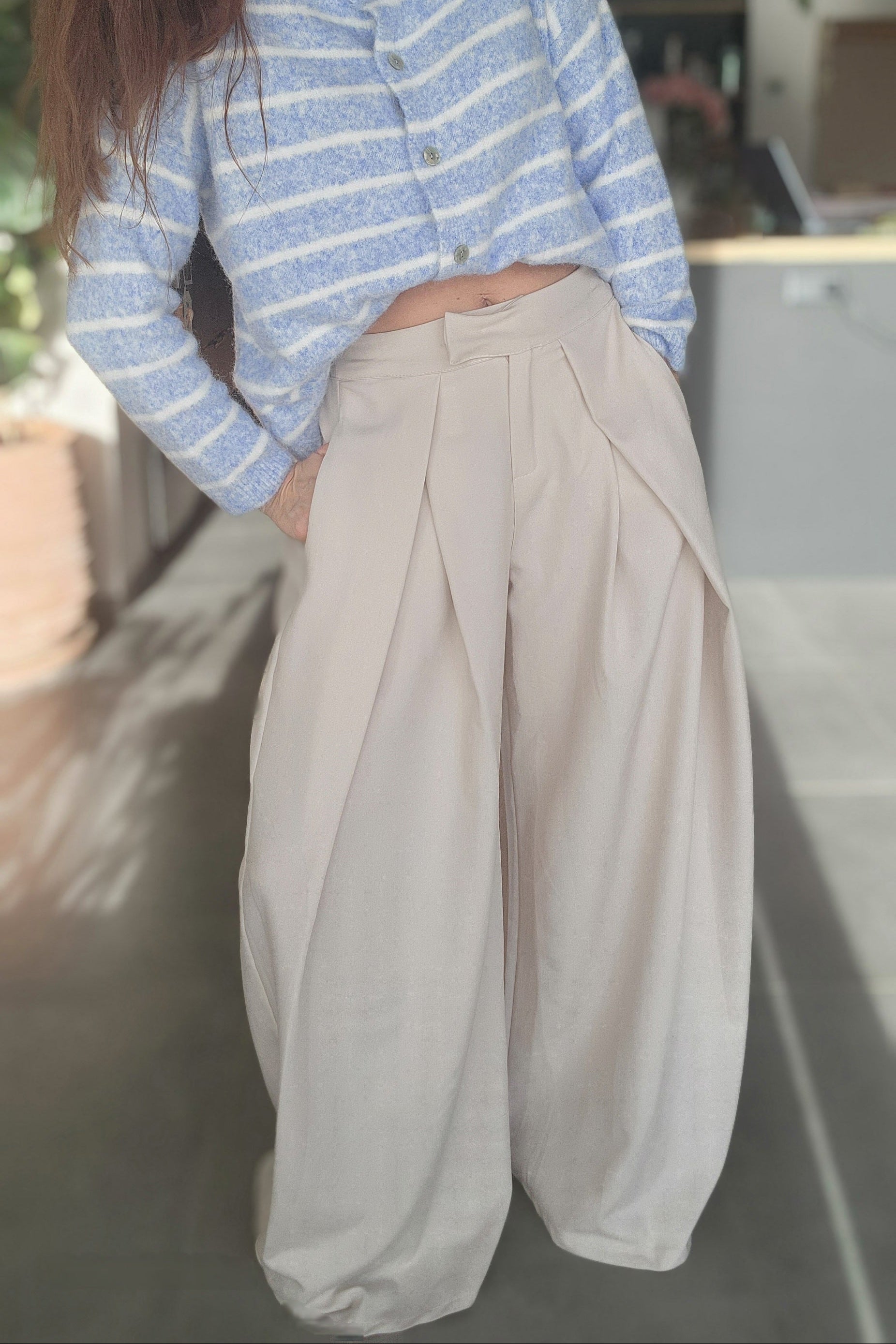 Le pantalon CUBA revisite le classique à pinces avec une coupe large très tendance. Taille haute et tombé impeccable, il structure la silhouette tout en restant ultra confortable grâce à sa taille élastiquée au dos.