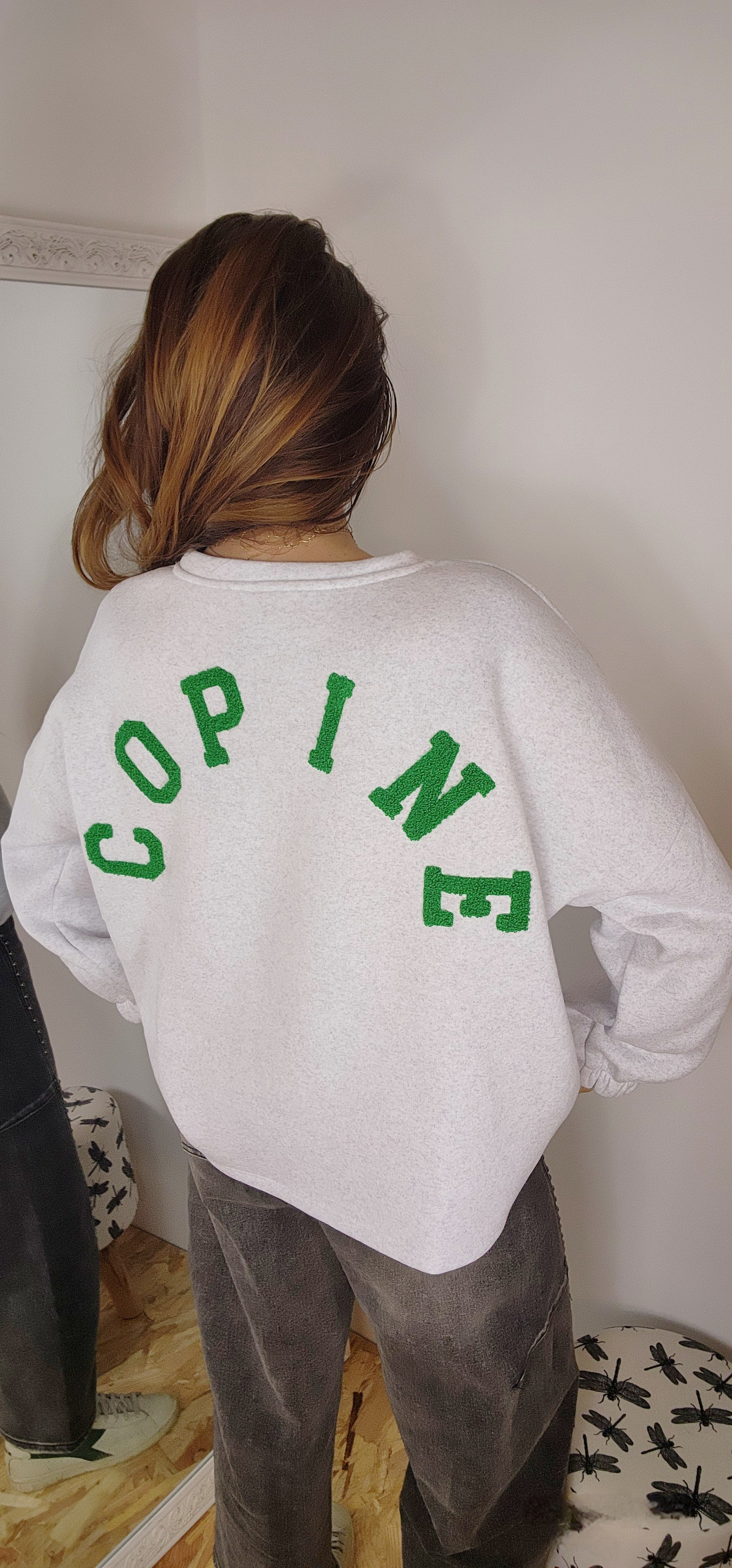 Ce sweat oversize vous enveloppe de douceur grâce à son intérieur moelleux, parfait pour un confort absolu. Son inscription COPINE en bouclette au dos affirme votre style avec caractère et modernité, tandis que ses manches élastiquées aux poignets créent une silhouette contemporaine et décontractée.